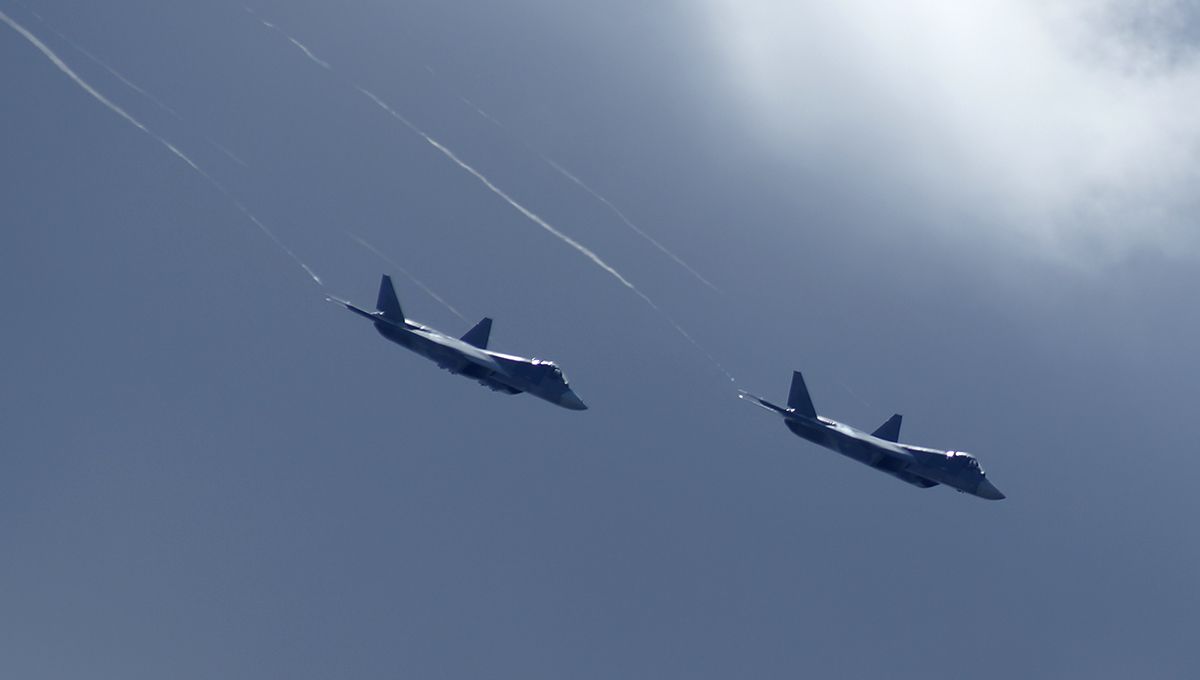 Су-57 — двухдвигательный истребитель тяжёлого класса с максимальной скоростью порядка двух Махов. Максимальная дальность полёта на дозвуковой крейсерской скорости при использовании 100% топлива составляет 4300 км. С подвесными топливными баками (ПТБ-2000 или ПТБ-3400) она увеличивается до 5500 км. На сверхзвуковой скорости без использования форсажа дальность полёта при полном баке топлива самолёт может пролететь до 2000 км. Су-57 может применять широкий спектр вооружения как по наземным или морским целям, так и по воздушным.